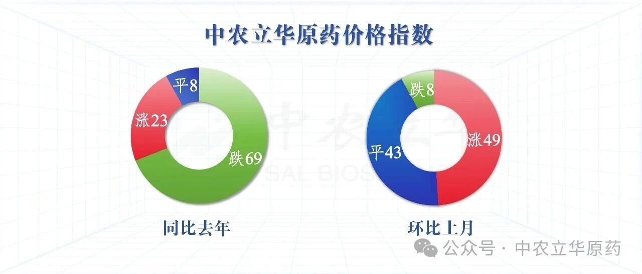 2026年3月15日,中农立华原药价格指数报74.57点,同比去年上涨3.09%,环比上月上涨6.27%。跟踪的上百个产品中,同比去年69%产品下跌,8%产品持平,23%产品上涨;环比上月8%产品下跌,43%产品持平,49%产品上涨。