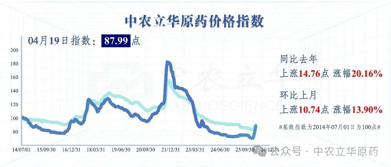 2026年4月19日,中农立华原药价格指数报87.99点,同比去年上涨20.16%,环比上月上涨13.90%。跟踪的上百个产品中,同比去年49%产品下跌,12%产品持平,39%产品上涨;环比上月4%产品下跌,38%产品持平,58%产品上涨。