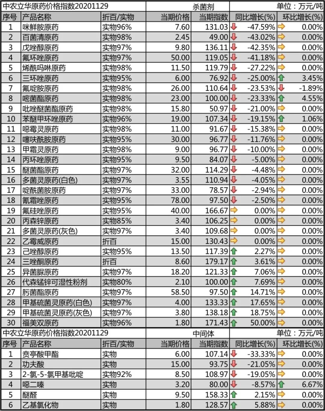 2020年11月22日中农立华杀菌剂原药价格指数报92.78点,环比上月微涨0.57%。2020年11月29日中农立华杀菌剂原药价格指数报94.45点,环比上月上涨2.4%。其中氟啶胺原药(-7.1%)跌幅居前,甲基硫菌灵原药(8.1%)、嘧菌酯原药(7.0%)等上涨超过5%,涨幅较大。