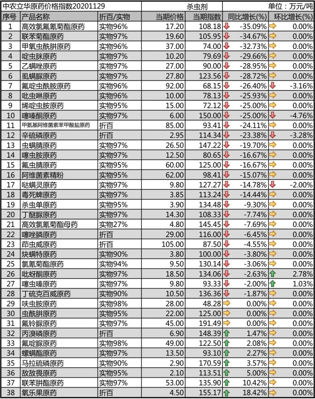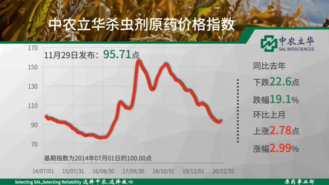 2020年11月29日中农立华杀虫剂原药价格指数报95.71点,同比去年大幅下跌19.1%,但受基础原材料上涨的影响,烟碱类产品为代表的产品触底反弹,吡蚜酮原药(8.8%)、吡虫啉原药(8.7%)、噻虫嗪原药(6.5%)等上涨超过5%,指数环比上月上涨3.0%。上涨:丙溴磷原药、敌敌畏原药、氧乐果原药、氟啶脲原药、马拉硫磷原药、螺螨酯原药、联苯肼酯原药等下跌:氟啶虫酰胺原药、噻嗪酮原药、辛硫磷原药、哒螨灵原药等