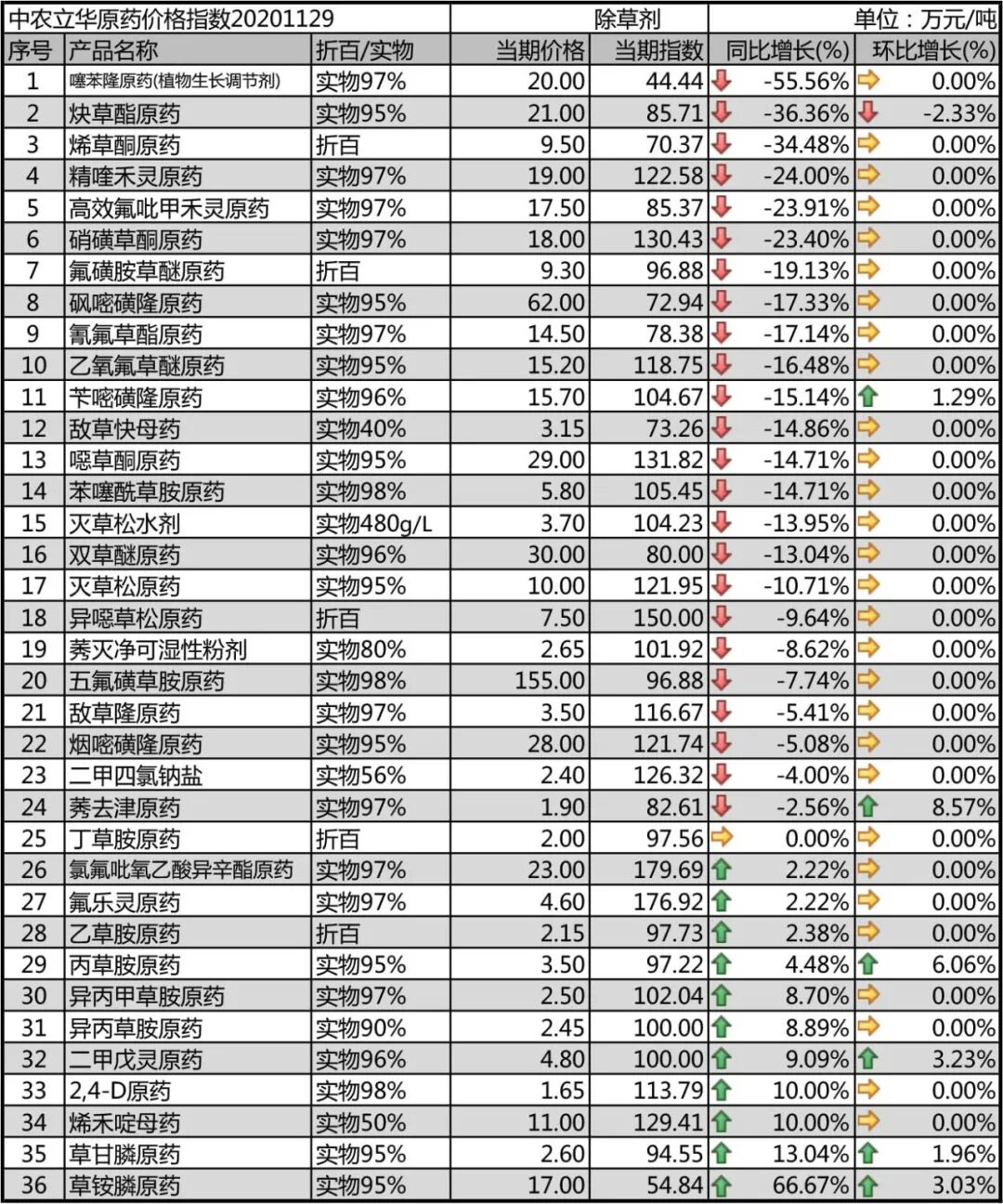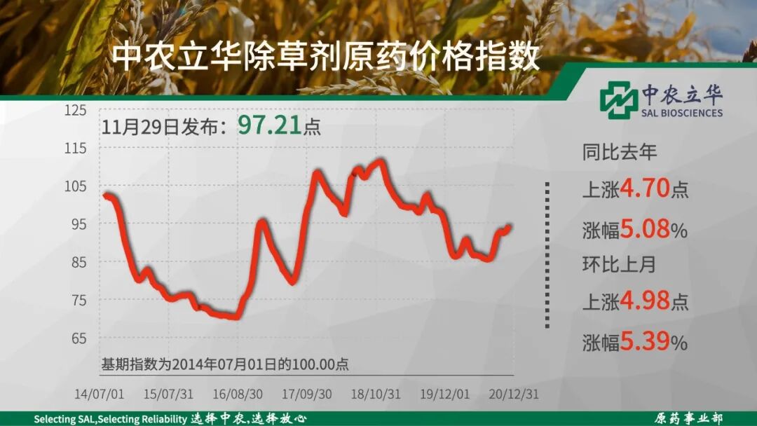 2020年11月29日中农立华除草剂原药价格指数报97.21点,环比上月大涨5.4%,莠去津原药(11.8%)、草铵膦原药(6.2%)、草甘膦原药(6.1%)、丙草胺原药(6.1%)、丁草胺原药(5.3%)大幅上涨超5%。