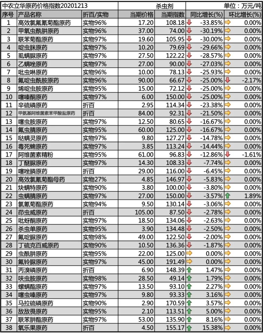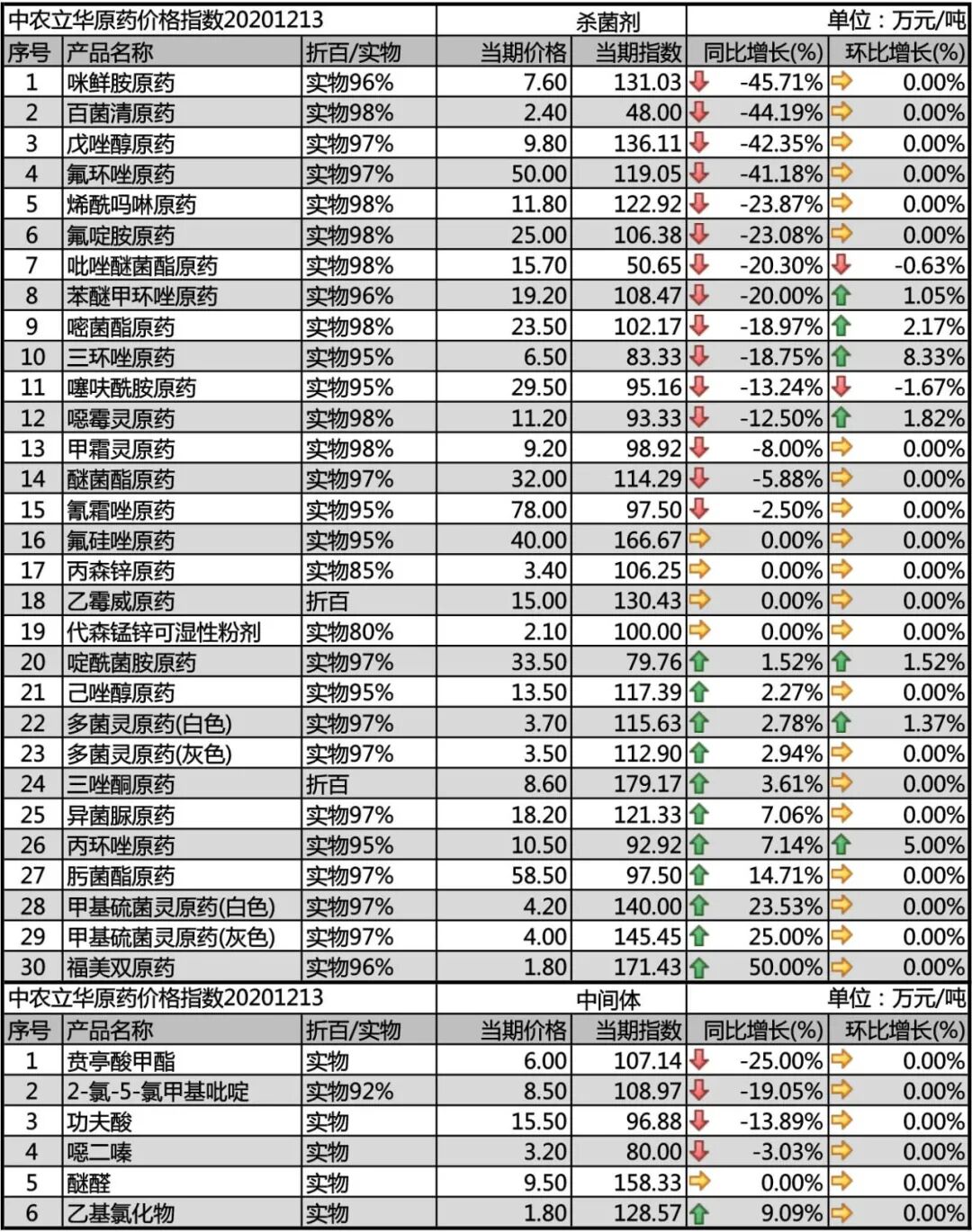 2020年12月13日,中农立华原药价格指数报98.09点,环比上月大涨4.7%,环比上涨品种创出新高。