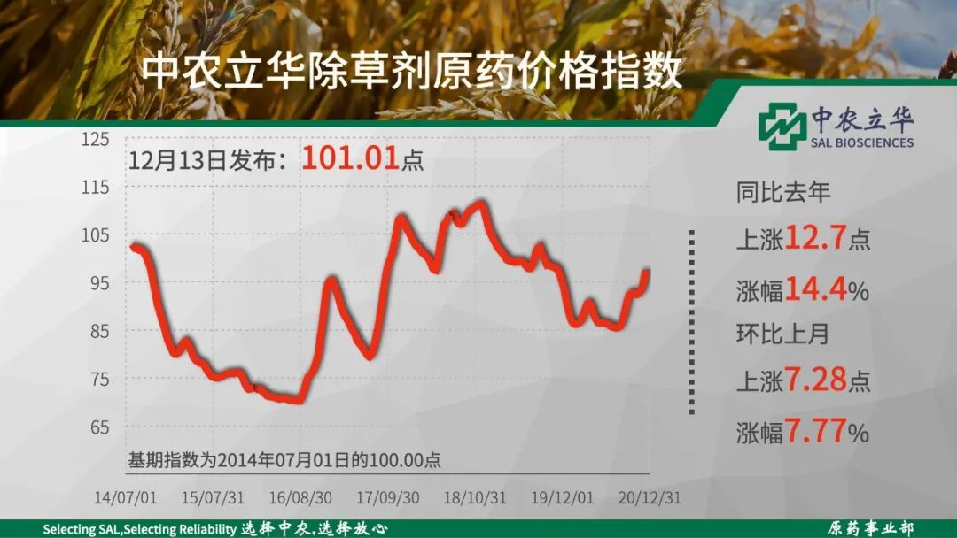 2020年12月13日中农立华除草剂原药价格指数报101.01点,受草甘膦原药、酰胺类原药大幅上涨影响,指数环比上月大涨7.8%,本月莠去津原药(14.7%)、草甘膦原药(10.0%)、烯禾啶原药(9.1%)、二甲戊灵原药(7.5%)、丁草胺原药(7.5%)、异丙草胺原药(6.1%)、丙草胺原药(6.1%)上涨超5%,硝磺草酮原药下跌5.6%。