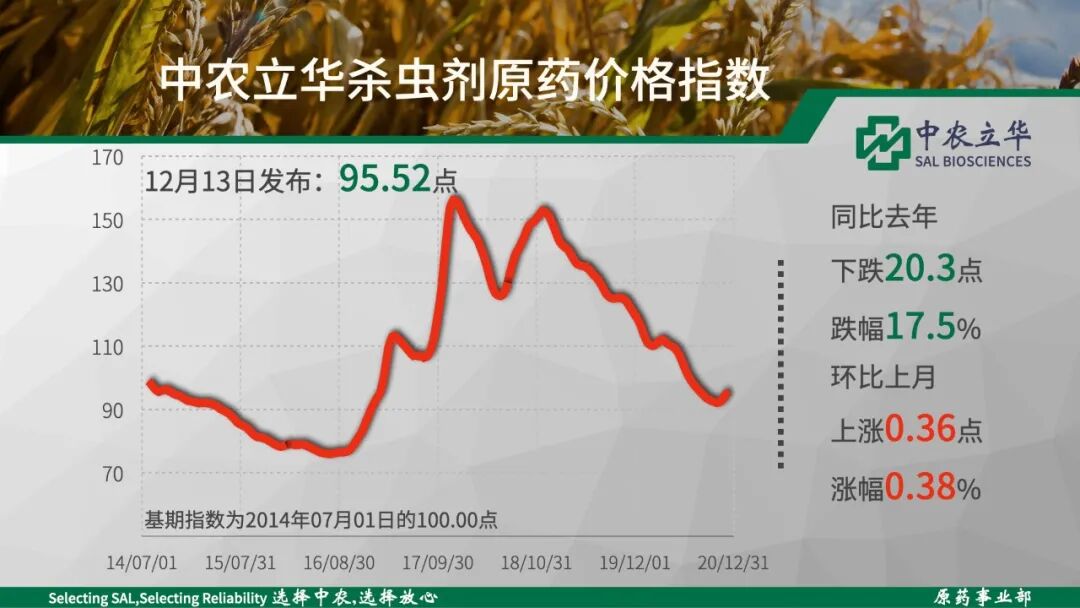 2020年12月13日中农立华杀虫剂原药价格指数报95.52点,同比去年大幅下跌17.5%,相比除草剂、杀菌剂的猛涨,杀虫剂较为平稳,仅吡蚜酮原药(5.7%)环比上涨超过5%,指数环比上月基本持平。