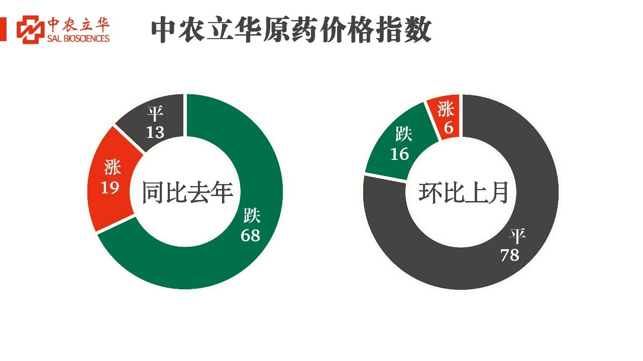 2025年10月12日,中农立华原药价格指数报74.73点,同比去年下跌0.66%,环比上月下跌0.09%。跟踪的上百个产品中,同比去年68%产品下跌;环比上月78%产品持平,6%产品上涨。