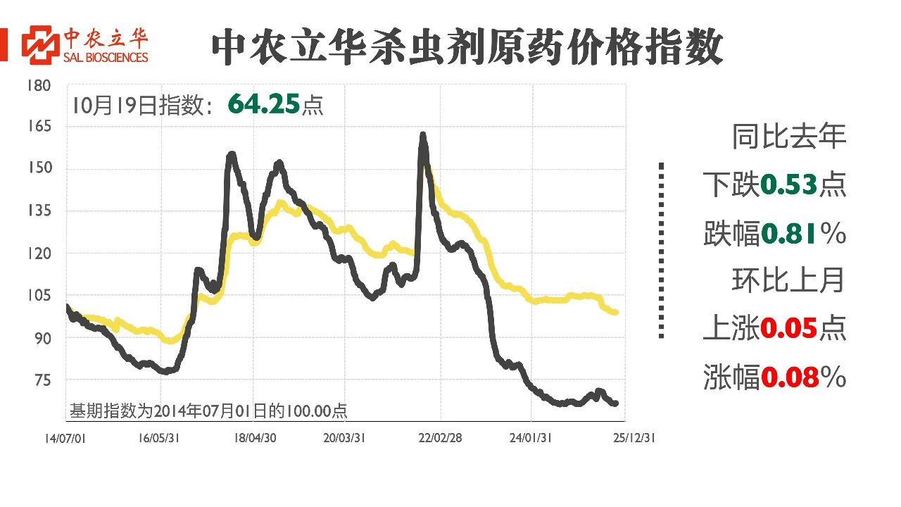 2025年10月19日,中农立华杀虫剂原药价格指数报64.25点,同比去年下跌0.81%,环比上月上涨0.08%。