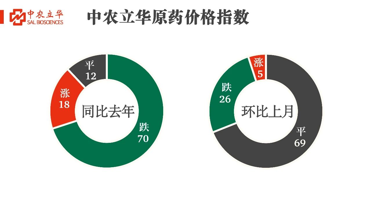 2025年10月26日,中农立华原药价格指数报74.92点,同比去年上涨1.12%,环比上月上涨0.11%。跟踪的上百个产品中,同比去年70%产品下跌;环比上月69%产品持平,5%产品上涨。